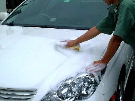 | まずは洗車! 最初に水をかけて埃を流し、 たっぷりの泡を使って表面の 汚れを落とします。 |